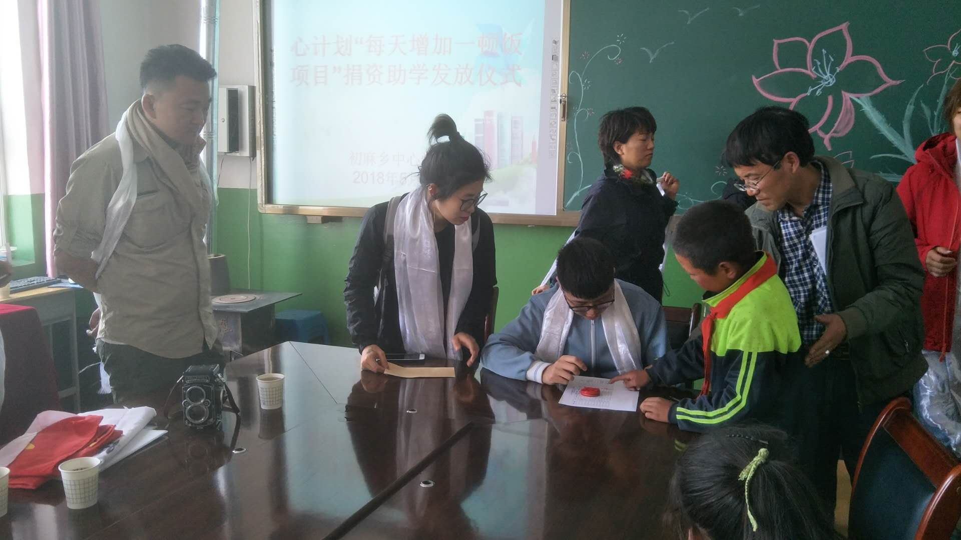2018年5月7日,在化隆县红十字会和教育局领导的带领下,来自北京的徐伟团长带领他的“心计划”青海助学行一对一午餐捐助项目工作人员向初麻中心学校的11名品行兼优且家境贫穷的少数民族学生,每人捐助了600元(一对一午餐捐助项目)资金,共计6600元.